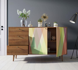 Корпус и ящики изготавливаются из ЛДСП австрийской компании "EGGER". Ножки мы делаем из массива ясеня и крепим на стальную пластину, на дверях петли с доводчиком а на ящиках шариковые направляющие. Принт на фасады наносится принтером специальными УФ - чернилами.
