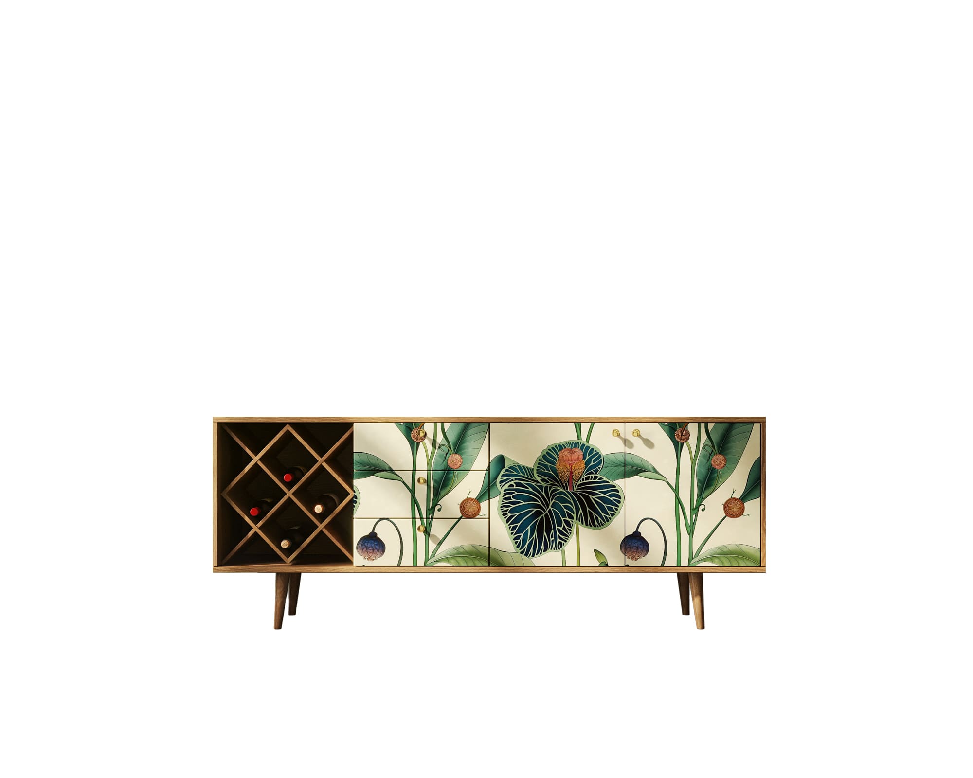 Комод "Berber" удлиненный с бутылочницей принт 7. Удлиненный комод "Berber" снабжен бутылочницей, тремя небольшими ящиками, а за дверцами пространство разделено полкой. Комод функционален и может служить тумбой под TV, дополнением к дивану в гостиной, который зонирует пространство комнаты или быть самостоятельным арт-объектом.