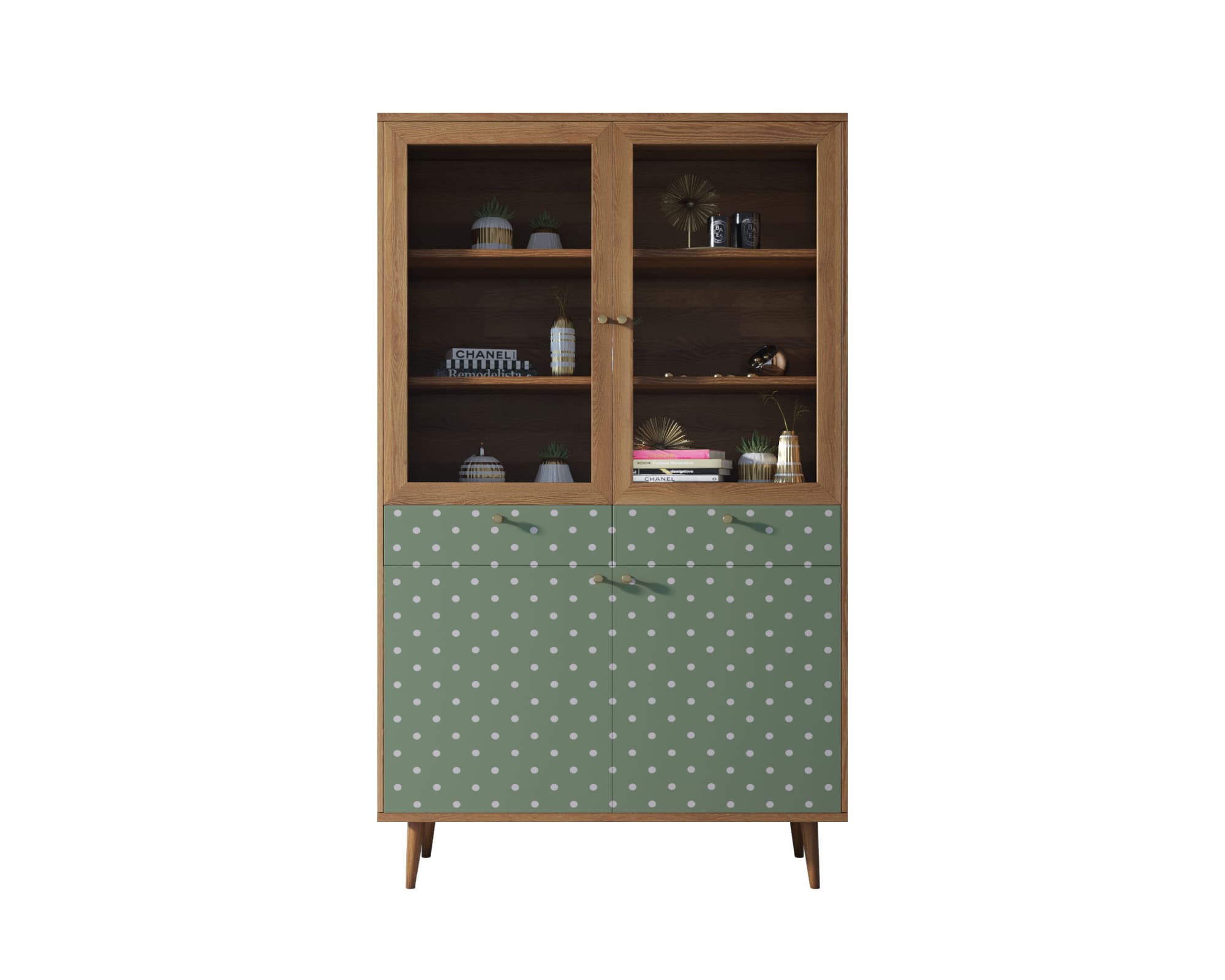 Буфет "Berber" имеет два выдвижных ящика на шариковых направляющих (могут быть заменены на доводчики по желанию). Низ буфета разделен на две секции, которые скрываются за двумя дверками, и полкой. Верхняя часть закрывается стеклянными дверцами, а на двух полках отлично расположится декор или кухонная утварь.