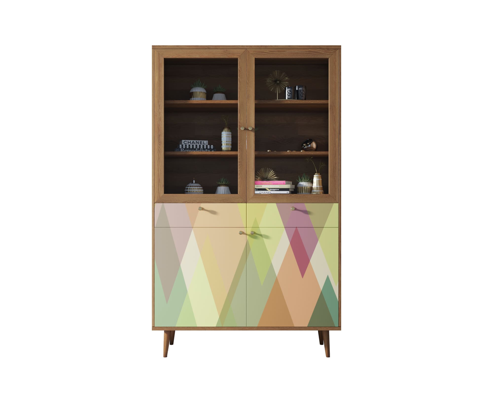 Буфет "Berber" имеет два выдвижных ящика на шариковых направляющих (могут быть заменены на доводчики по желанию). Низ буфета разделен на две секции, которые скрываются за двумя дверками, и полкой. Верхняя часть закрывается стеклянными дверцами, а на двух полках отлично расположится декор или кухонная утварь.
