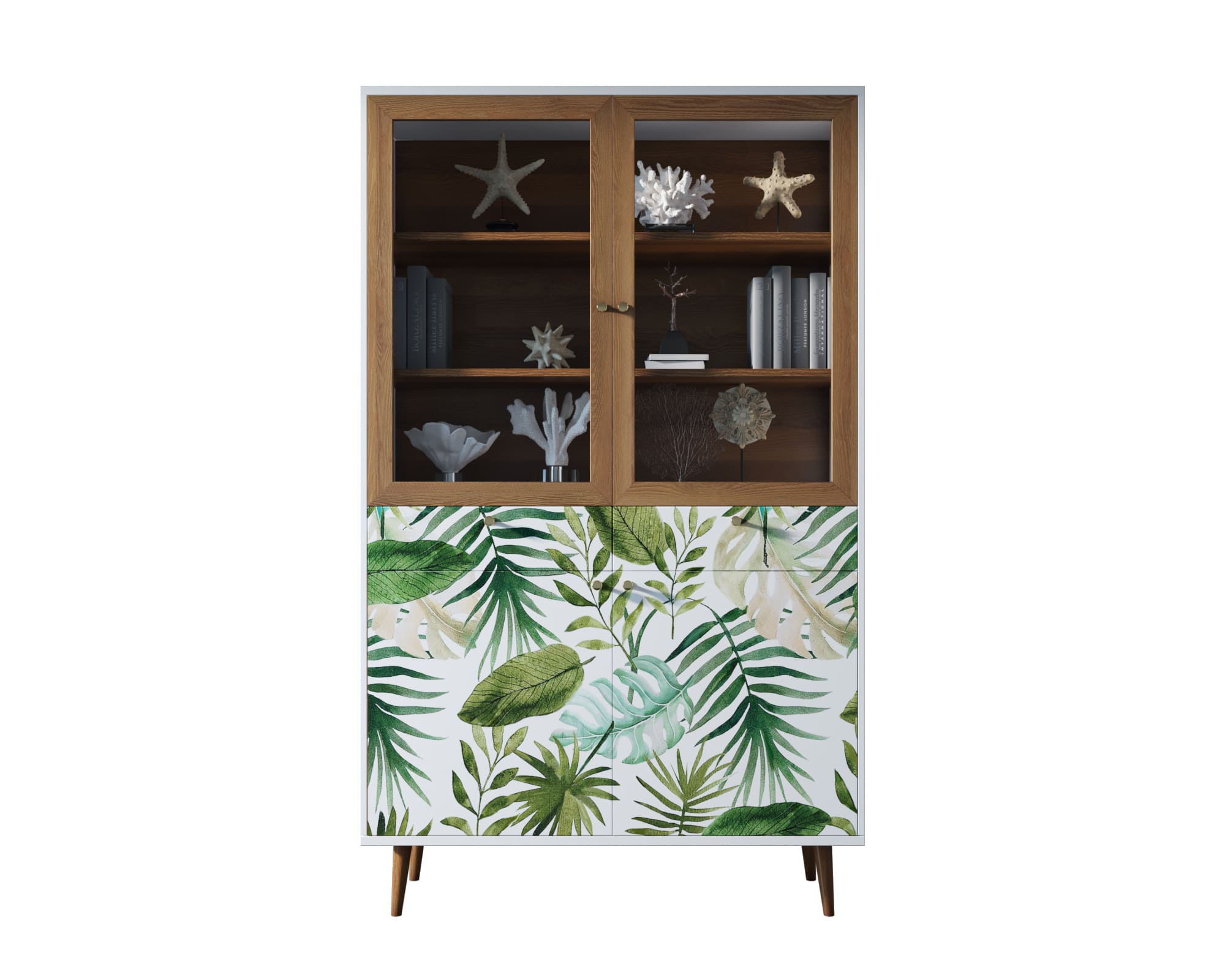 Корпус и ящики изготавливаются из ЛДСП австрийской компании "EGGER". Ножки мы делаем из массива ясеня и крепим на стальную пластину, на дверях петли с доводчиком а на ящиках шариковые направляющие. Принт на фасады наносится принтером специальными УФ - чернилами.