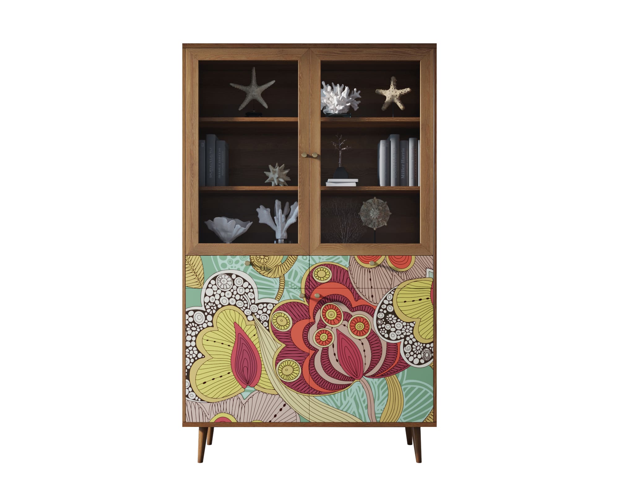 Корпус и ящики изготавливаются из ЛДСП австрийской компании "EGGER". Ножки мы делаем из массива ясеня и крепим на стальную пластину, на дверях петли с доводчиком а на ящиках шариковые направляющие. Принт на фасады наносится принтером специальными УФ - чернилами.
