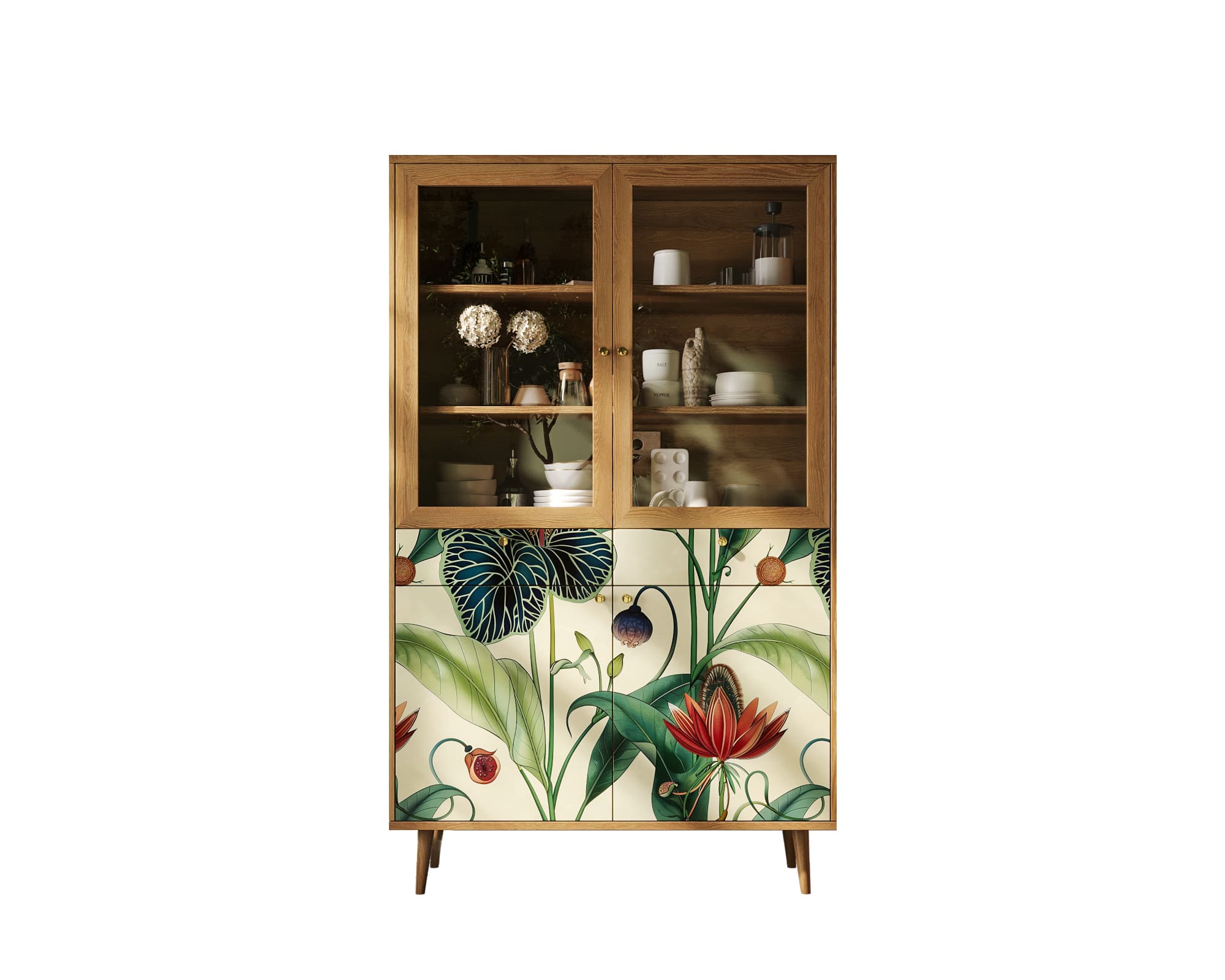 Буфет "Berber" имеет два выдвижных ящика на шариковых направляющих (могут быть заменены на доводчики по желанию). Низ буфета разделен на две секции, которые скрываются за двумя дверками, и полкой. Верхняя часть закрывается стеклянными дверцами, а на двух полках отлично расположится декор или кухонная утварь.