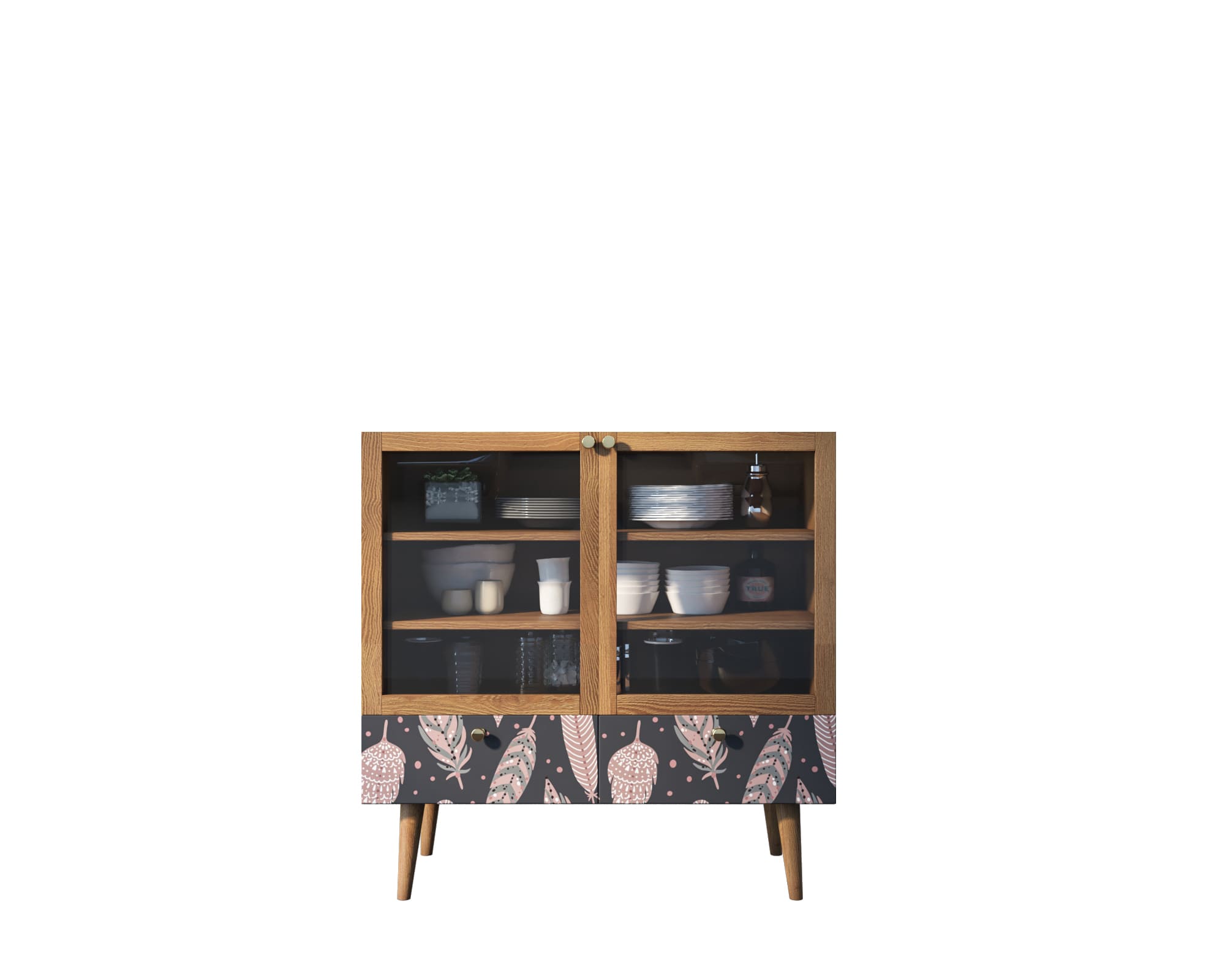 Компактный буфет, удлиненный по горизонтали, разделен на три вместительные полки и два выдвижных ящика с ярким скандинавским принтом. Предметы, которые будут размещены внутри буфета, просматриваются сквозь прозрачное стекло нескольких створок. Каркас из ЛДСП возвышается на ножках из прочного массива ясеня. Сверху низкого комода удобно размещать мелкие детали и предметы декора.