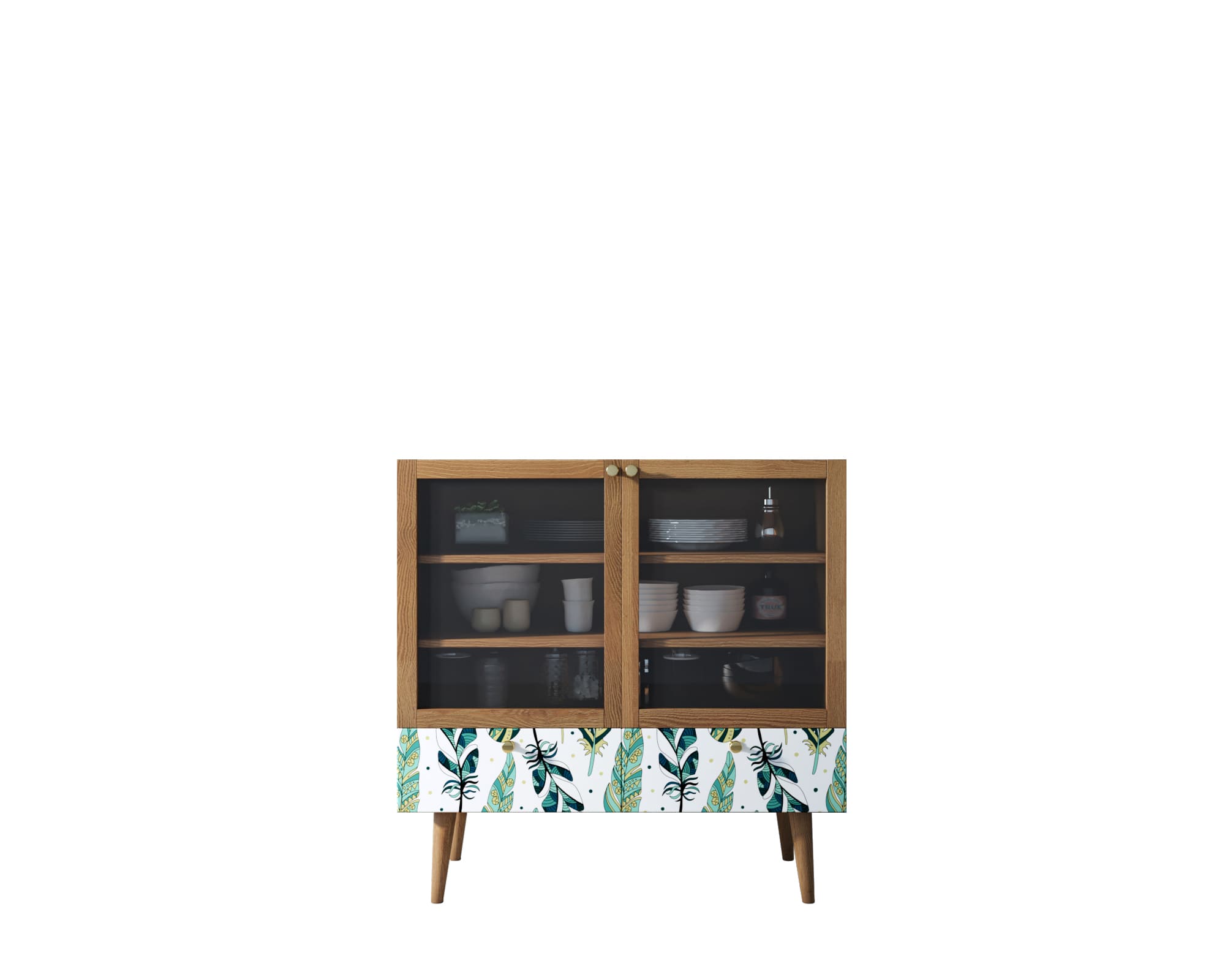 Невысокий буфет на ножках представлен в прямоугольной форме. Модель снабжена двумя застекленными дверцами с ручками, внутренними полками и нижним продольным ящиком с красочным принтом. При производстве мебели использована ЛДСП для корпуса и натуральное дерево для ножек.