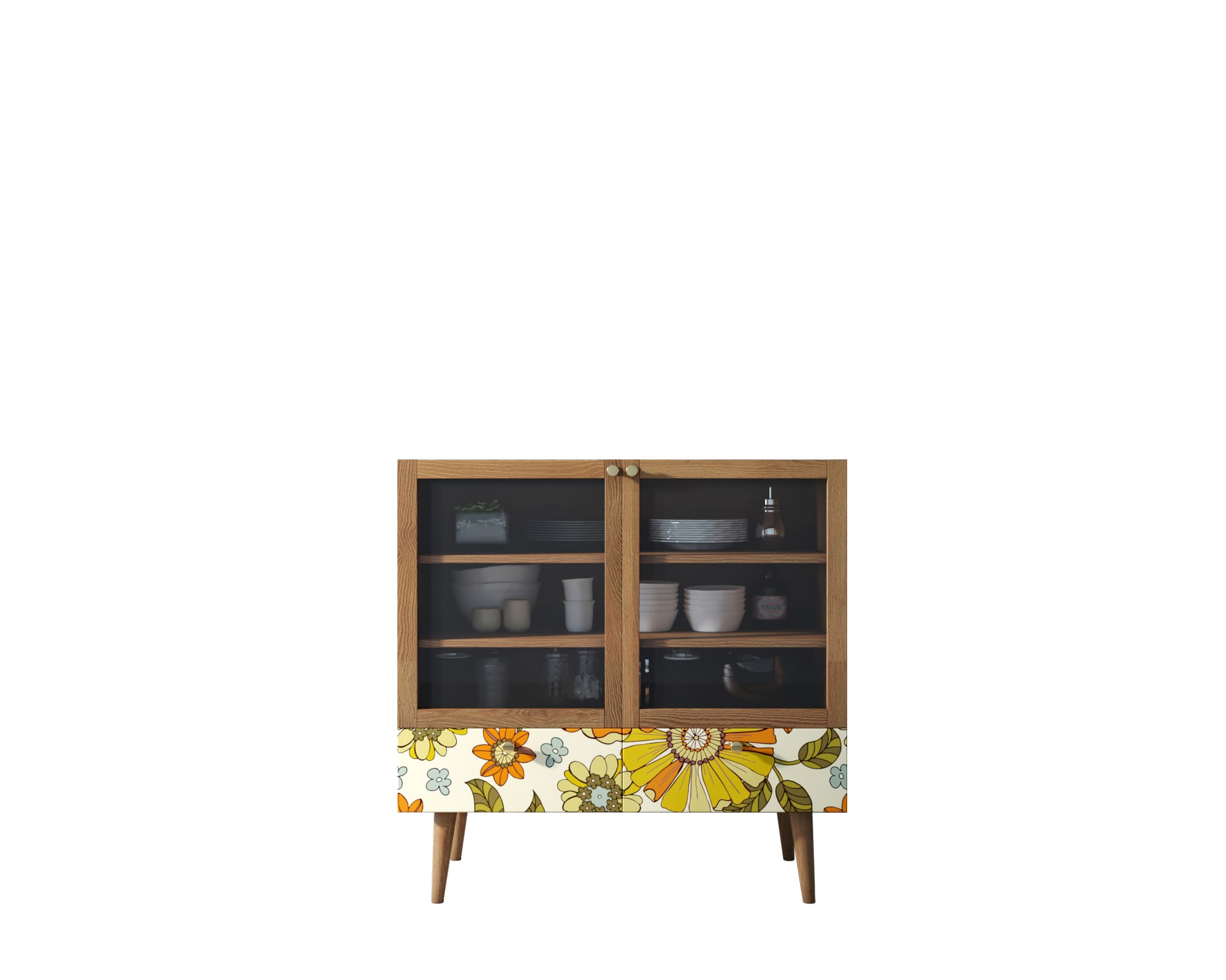 Изящный невысокий комод выглядит компактно и не громоздко. Внутри за стеклянными створками размещаются три удобных полки для кухонной утвари. Снизу конструкцию украшают два выдвижных ящика с ярким цветочным принтом. Такой комод вдохнет свежесть и хорошее настроение в помещения, оформленные в стилях скандинавский, кантри, прованс, этно, авангард..