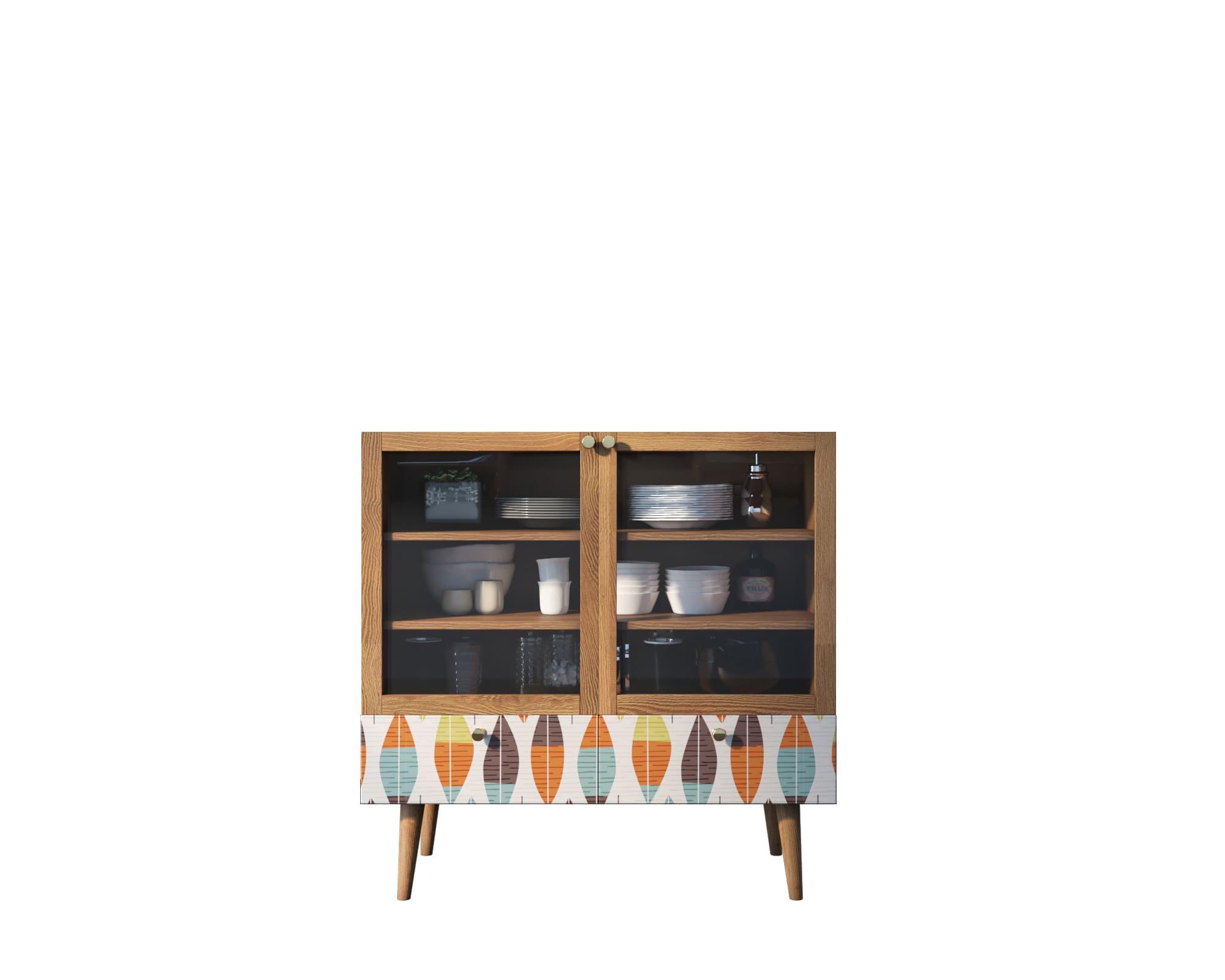 Буфет "Berber" – оригинальная модель с выделяющимся внешним видом, поэтому ее лучше комбинировать с предметами мебели из аналогичной коллекции. Корпус изделия сделан из ЛДСП, высокие ножки изготовлены из массива ясеня. Обе дверцы буфета выполнены из прозрачного стекла, поэтому кухонную утварь внутри шкафа будет видно хорошо. Снизу буфет оформлен ящиком с лиственным принтом в яркой расцветке, благодаря чему изделие можно отнести к стилям этно или скандинавскому.