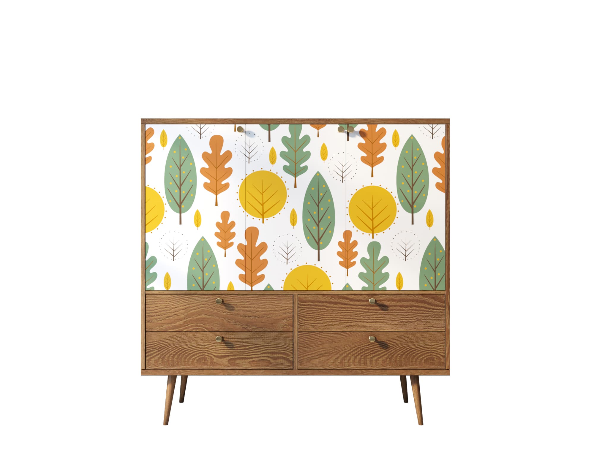 Корпус и ящики изготавливаются из ЛДСП австрийской компании "EGGER". Ножки мы делаем из массива ясеня и крепим на стальную пластину, на дверях петли с доводчиком а на ящиках шариковые направляющие. Принт на фасады наносится принтером специальными УФ - чернилами.