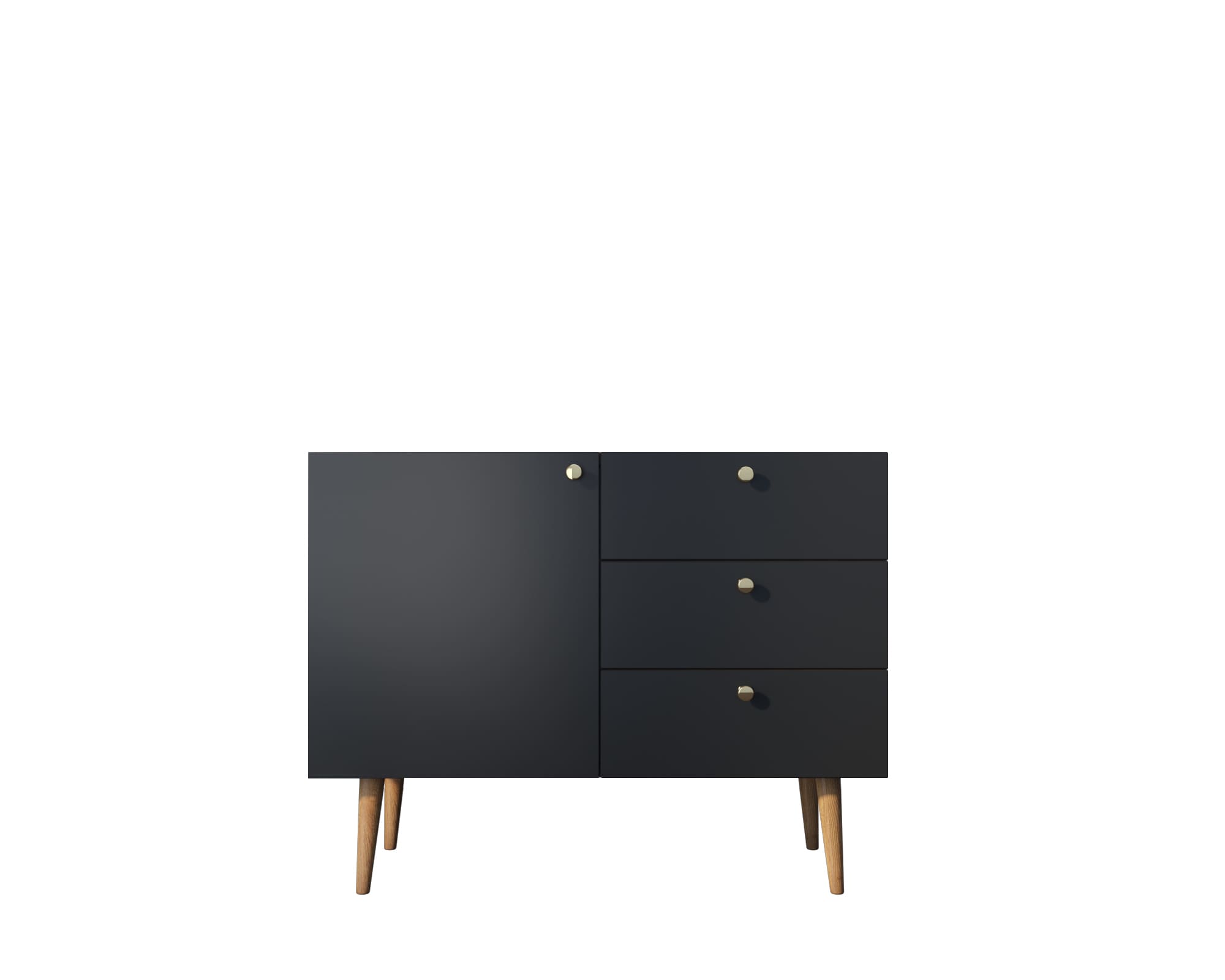В компактном комоде три ящика и полка в левой секции за дверкой. Фасад украшает принт в спокойных тонах. Петли на дверях с доводчиком, ящики на шариковых направляющих. Для изготовления модели применены два вида материалов: ЛДСП для корпуса и массив ясеня для ножек.
