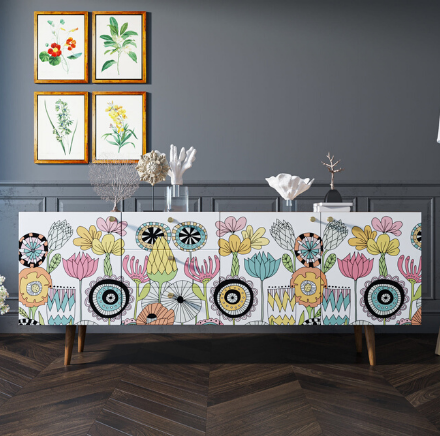 Корпус и ящики изготавливаются из ЛДСП австрийской компании "EGGER". Ножки мы делаем из массива ясеня и крепим на стальную пластину, на дверях петли с доводчиком а на ящиках шариковые направляющие. Принт на фасады наносится принтером специальными УФ - чернилами.