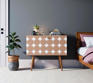 Корпус и ящики изготавливаются из ЛДСП австрийской компании "EGGER". Ножки мы делаем из массива ясеня и крепим на стальную пластину, на дверях петли с доводчиком а на ящиках шариковые направляющие. Принт на фасады наносится принтером специальными УФ - чернилами.