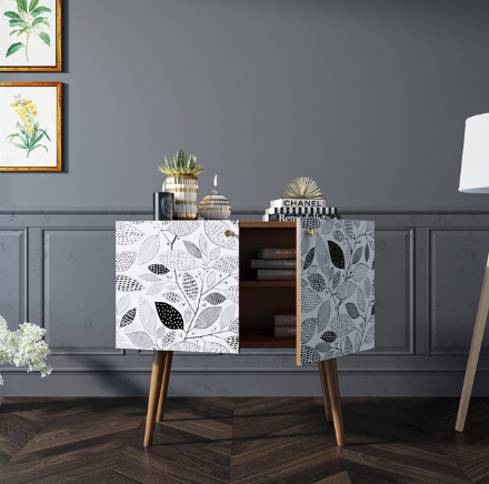 Корпус и ящики изготавливаются из ЛДСП австрийской компании "EGGER". Ножки мы делаем из массива ясеня и крепим на стальную пластину, на дверях петли с доводчиком а на ящиках шариковые направляющие. Принт на фасады наносится принтером специальными УФ - чернилами.