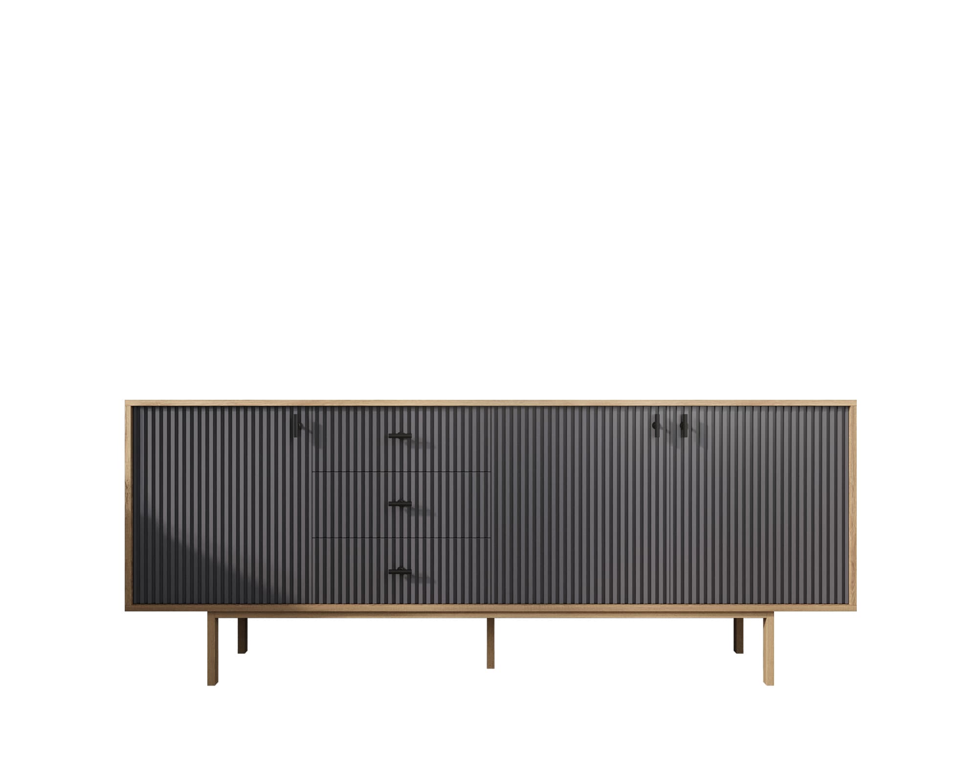 Комод в скандинавском стиле "Emerson" в черном корпусе имеет три дверки на петлях с доводчиком и три ящика. Ниша внутри поделена на две секции съемной полкой. Платформа на деревянных ножках обеспечивает устойчивость модели. Ручки изготовлены из металла.