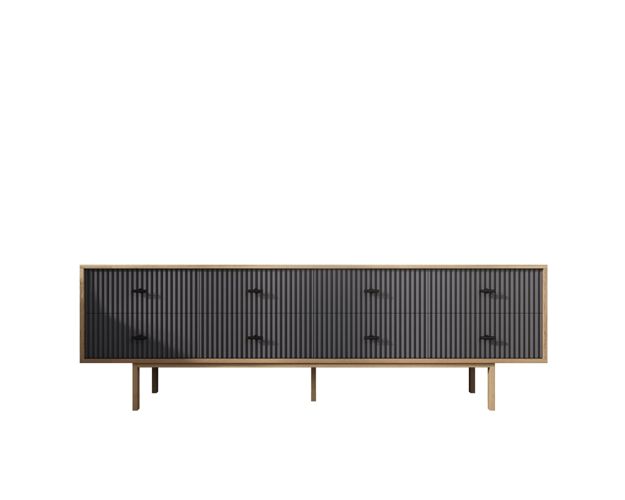 Комод в скандинавском стиле "Emerson" в черном корпусе имеет восемь ящиков на шариковых направляющих. Платформа на деревянных ножках. Ручки из металла.
