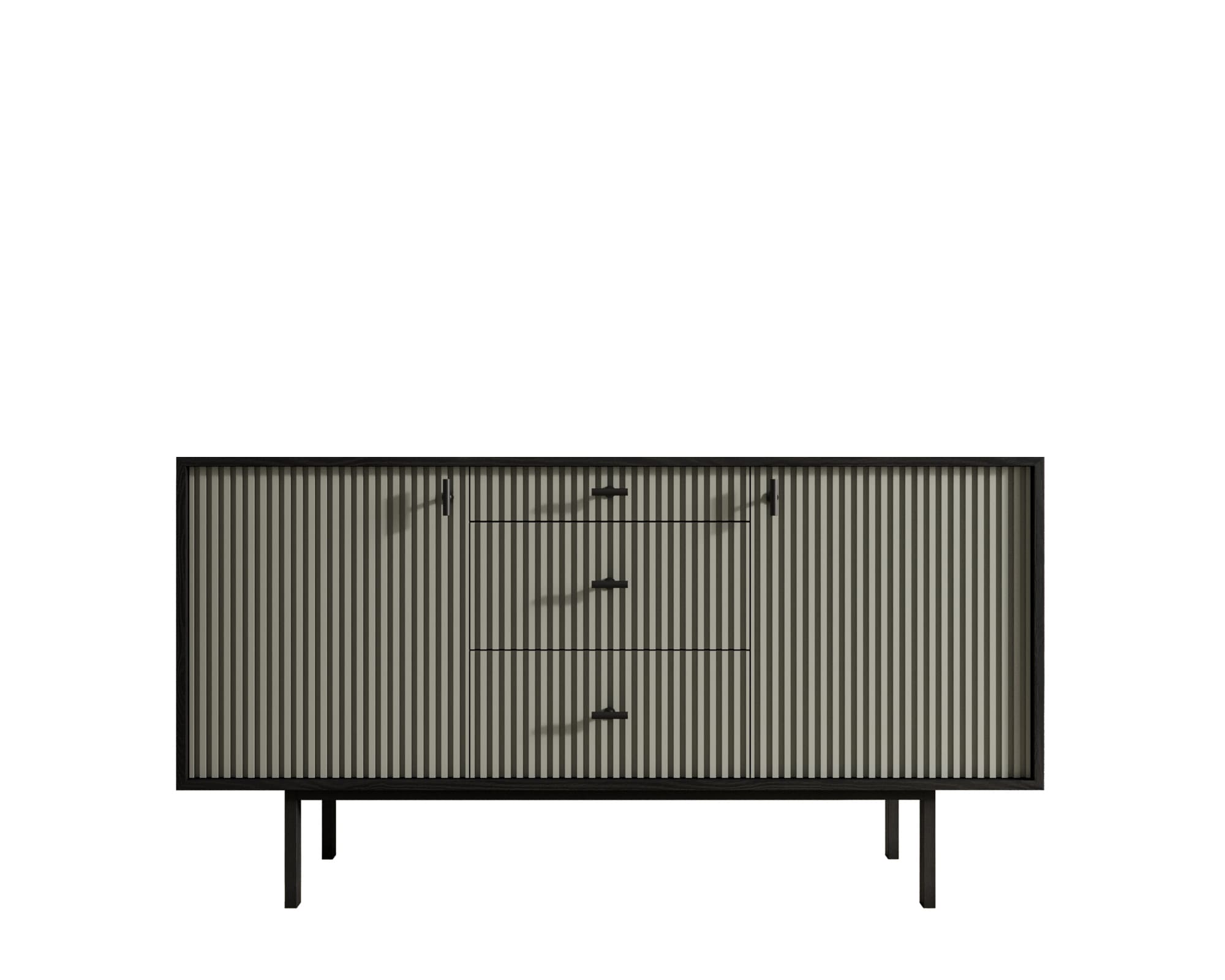 Комод в скандинавском стиле "Emerson" в тонком черном корпусе имеет две дверки на петлях с доводчиком. Ниша внутри поделена на две секции съемной полкой. Платформа на деревянных ножках обеспечивает устойчивость модели. Ручки изготовлены из металла.
