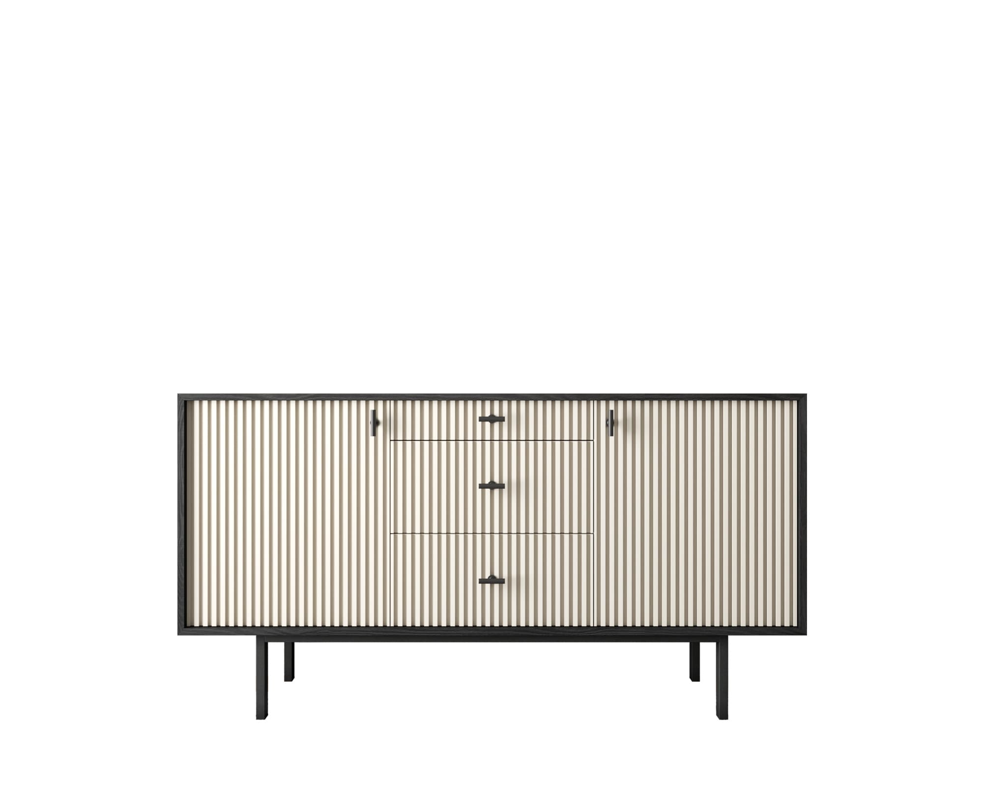 Комод в скандинавском стиле "Emerson" в тонком черном корпусе имеет две дверки на петлях с доводчиком. Ниша внутри поделена на две секции съемной полкой. Платформа на деревянных ножках обеспечивает устойчивость модели. Ручки изготовлены из металла.