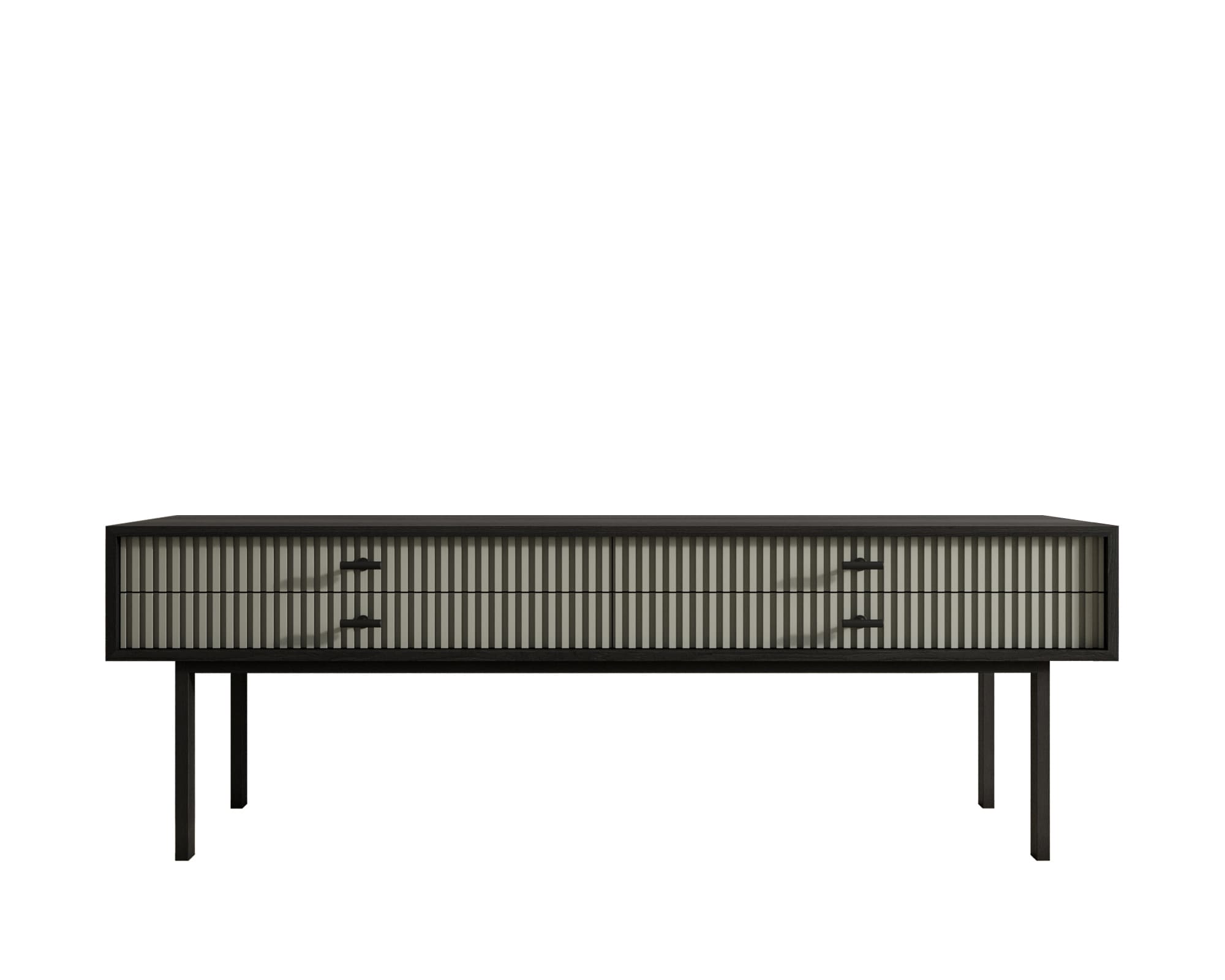 Комод в скандинавском стиле "Emerson" в тонком черном корпусе имеет четыре дверки на петлях с доводчиком. Ниша внутри поделена на две секции съемной полкой. Ножки сделаны из массива дерева, что обеспечивает прочность платформы и покрыты темной морилкой. Цвет ножек или фасадов может быть изменен по вашему желанию .