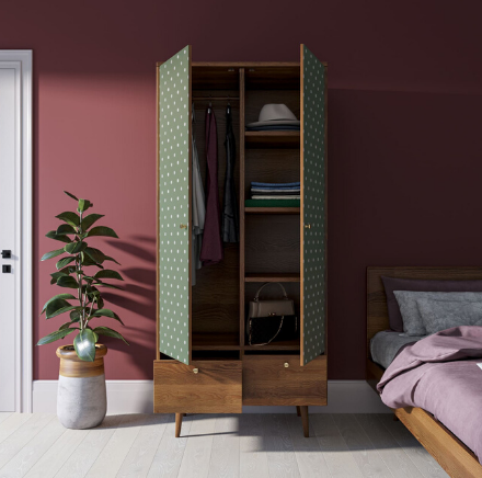 Двухстворчатый шкафы "Berber" имеет два глубоких, выдвижных ящика на шариковых направляющих и два отделения за дверками. Слева за дверью располагается съемная штанга, а справа три полки. Шкаф достаточно функционален и не займет много места, ведь ширина всего 90 см. Можно разместить в спальне или прихожей.