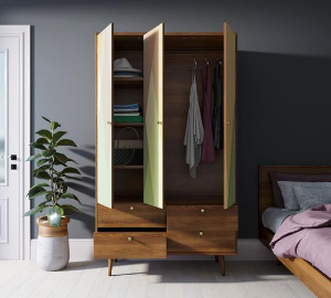 Трехстворчатый шкаф "Berber" имеет четыре вместительных, выдвижных ящика на шариковых направляющих и два больших отделения за дверками. Слева за дверкой располагаются три полки, а справа отделение со съемной штангой. Шкаф достаточно функционален и при своих компактных размерах, в ширину всего 115 см, способен вместить достаточное количество вещей.