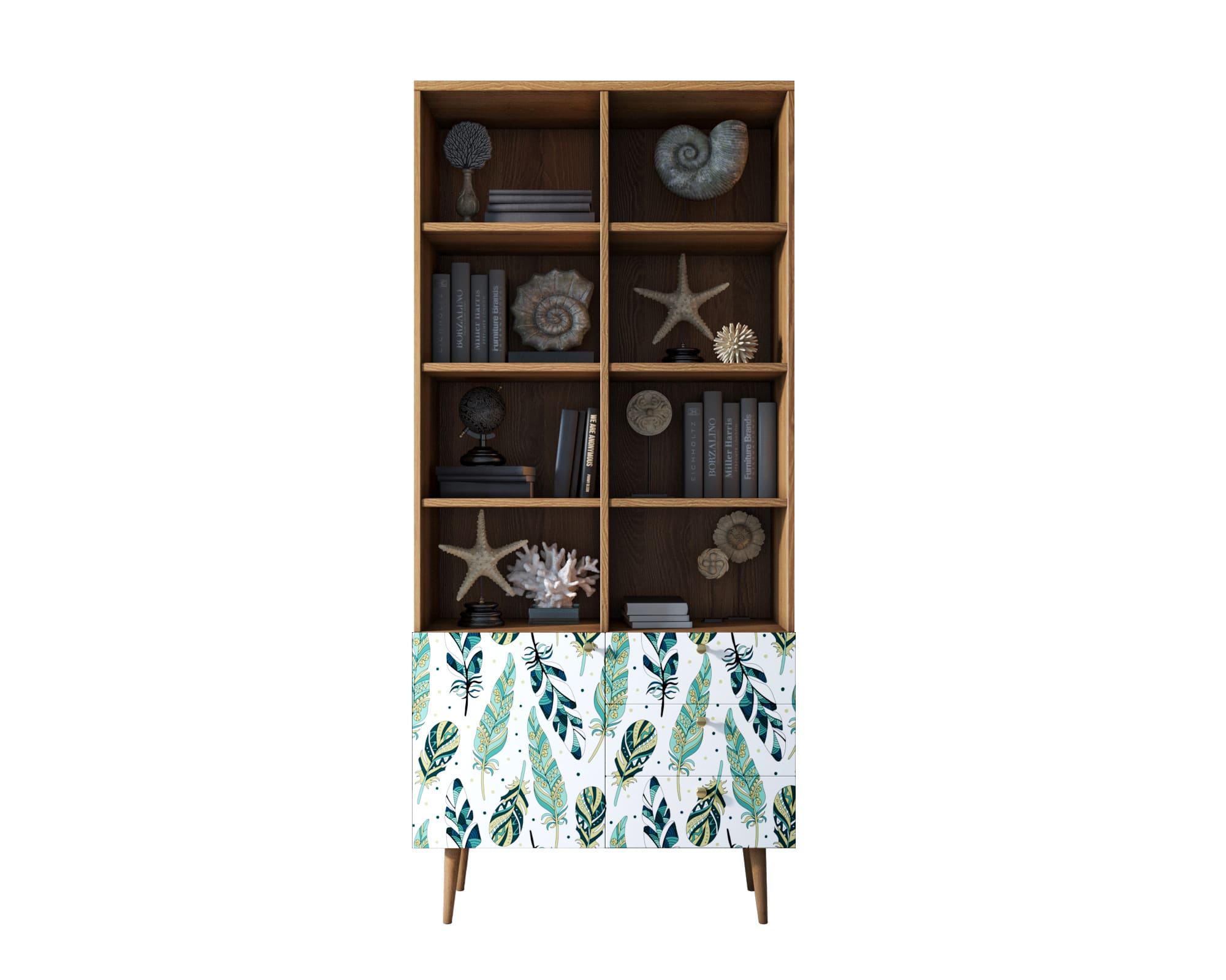 Стеллаж с дизайнерским принтом на фасаде имеет три небольших ящика полного выдвижения на шариковых направляющих. Левая секция за дверкой разделена полкой, которая регулируется по высоте. Ноги изготовлены из прочного массива ясеня.