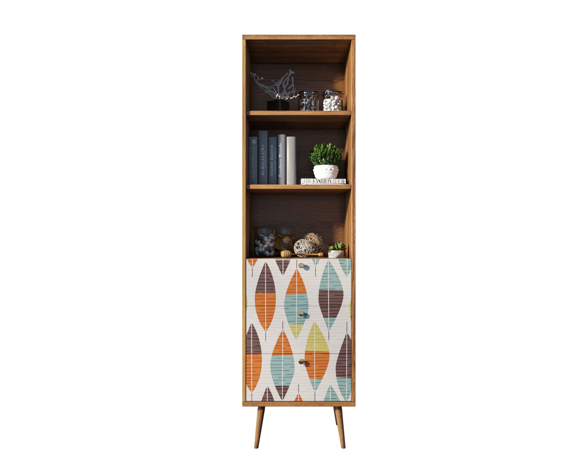 Узкий стеллаж Berber имеет три ящика полного выдвижения на шариковых телескопических направляющих. Фасад украшен принтом выполненный в спокойных тонах. Ножки изготовлены из прочного массива ясеня.