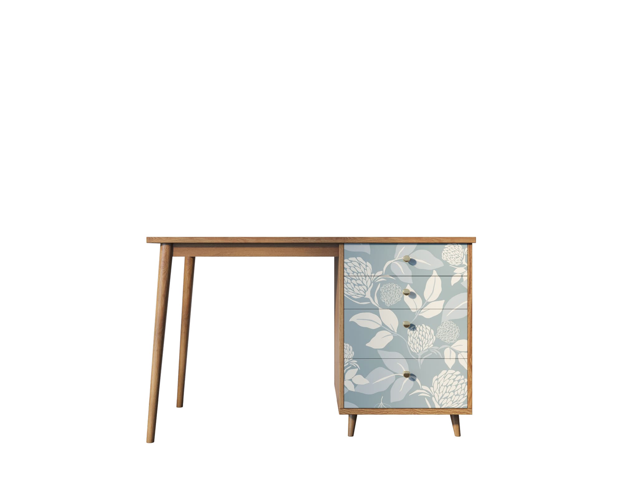 Рабочий стол "Berber" имеет четыре ящика на шариковых направляющих, цельное подстолье из натурального ясеня для улучшения устойчивости и дизайнерский принт на фасаде, который можно заменить по вашему желанию.